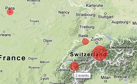 The map widget now shows all event locations, clustered. Click a bubble to zoom in–or use the normal map controls to zoom and scroll, and then click “filter” to update the map.