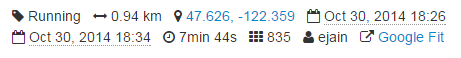 We added a google-activities task that lets you choose to retrieve either explicitly recorded exercise sessions, or automatically detected activities (which includes periods of “not moving” and “in vehicle”). To this, we add consolidated step counts and distances, as well as a starting location based on the platform’s location stream. We also look for any streams that have speed averages, calories expended or heart rate averages for the period of each activity.